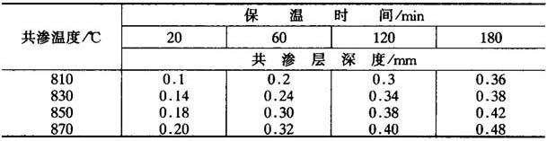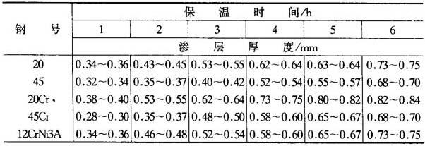 表15-41 820~840℃碳氮共渗时时间对几种结构钢渗层深度的影响