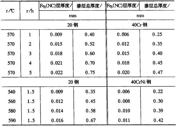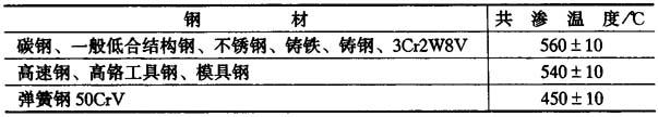 共渗温度和时间根据材料和渗层要求而定.各种材料的氮碳共渗温度见表15-43. 表15-43 各种材料的氮碳共渗温度