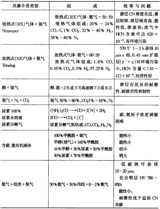 液体氮碳共渗后一般采取快冷,碳钢用水或10%NaCl水溶液冷却,而合金钢采用油冷和空冷. 2.气体氮碳共渗 几种气体氮碳共渗介质的组成及使用效果见表15-45. 表15-45 几种气体氮碳共渗介质的组成及使用效果