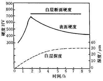 气体氮碳共渗温度都选在Fe-N共析温度附近,一般为570℃±10℃.碳钢、铸铁、低合金钢为570℃±10℃,3Cr2W8V为570~620℃,Cr12MoV为540℃±10℃,高速钢为560℃±10℃. 共渗时间对化合物层厚度和渗层硬度的影响见图15-39.从图中可得出:共渗时间为2~4h为佳,对于高速钢取1~1.5h为好.