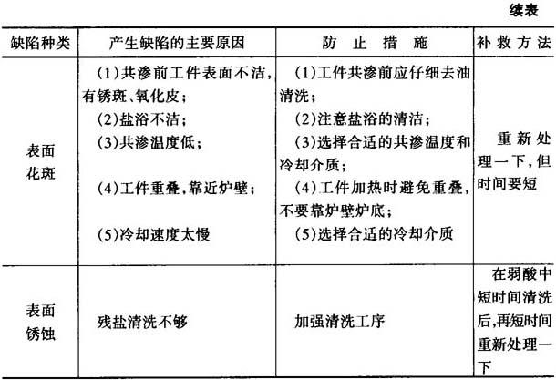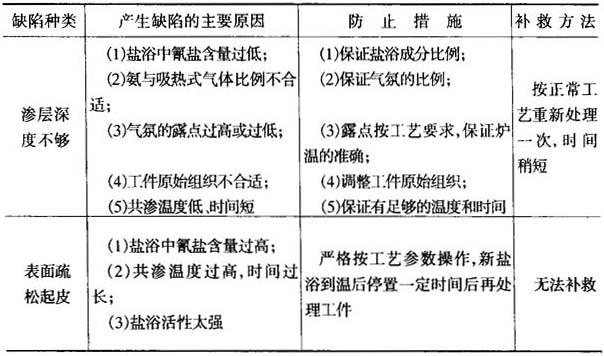 图15-39 软氮化时间对硬度与深度的影响(570℃4h,氨分解率46%) 氮碳共渗渗件的常见缺陷及防止方法见表15-46. 表15-46 氮碳共渗件常见的缺陷及防止方法