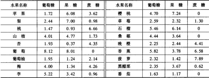 | 释义 | 碳水化合物 果蔬中的主要碳水化合物有糖、淀粉、纤维素和果胶等,是固形物中最主要的成分。碳水化合物在加工中会发生很多变化,对加工工艺和产品质量均有直接影响。 (一)糖 果蔬中可溶性固形物的主要成分是糖,包括单糖和双糖。单糖主要有葡萄糖和果糖,双糖为蔗糖。葡萄糖存在于植物的根、茎、叶、花等部位。果糖在水果中的含量较丰富。果蔬中的含糖量会因品种、收获季节等因素而有很大变化。甚至在从收获到加工的过程中,淀粉也会分解变成糖。很多未成熟的水果,例如苹果、梨、芒果、香蕉、西番莲、番茄等含有淀粉,在完熟过程中或在贮藏期内,淀粉在不断减少,含糖量会逐渐增加。各种糖在水果中的比例也会因水果种类有很大差异,例如浆果类水果和柑橘类水果以及成熟葡萄中,果糖和葡萄糖的含量比大致为1∶1,而在苹果中却为3∶1。不同水果中的糖含量参见表2-1-18。 表2-1-18 一些果蔬中主要糖的含量 单位:%(鲜重)