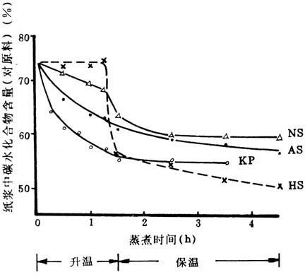 图4-3-14 蒸煮过程中纸浆碳水化合物含量的变化 KP-硫酸盐法 AS-碱性亚硫酸钠法 NS-中性亚硫酸钠法 HS-亚硫酸氢镁法