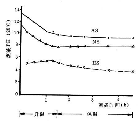 图4-3-15 蒸煮过程中药液pH的变化 荻在不同方法蒸煮过程中木质素与碳水化合物的变化趋势如图4-3-16所示。在蒸煮可漂浆时应考虑尽量除去木质素但又不使碳水化合物受到严重损伤。由图4-4-16可见,在浆中木质素含量2%左右(对原料1%左右)时各曲线均发生转折,沿等木质素碳水化合物则继续溶出,纸浆得率不断下降,因此应及时停止蒸煮。各转折点的纸浆得率为NS法63%、AS法62%、KP法57%、HS法54%,NS法>AS法>KP法>HS法。