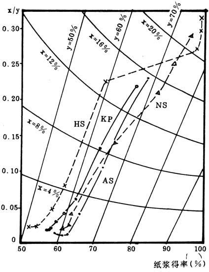 图4-3-16 罗斯图 x=纸浆中总木质素(Klsaon木质素+酸溶木质素)含量(对原料),(%); Y=纸浆中碳水化合物含量(对原料),(%) |