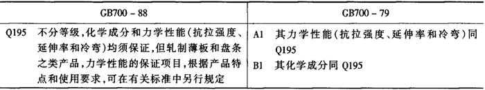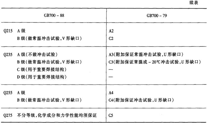 | 释义 | 碳素结构钢 碳素结构钢产量最大,用途最广,这类钢材一般不需经过热处理,在供货状态下(一般是热轧状态,特殊情况下也以正火处理状态供货)使用。 1.碳素结构钢牌号 根据GB700-88《碳素结构钢》的规定,碳素结构钢的牌号由代表屈服强度的字母、屈服强度的强度值、质量等级符号、脱氧方法符号等四个部分按顺序组成。例如 Q235-A·F其中:Q是钢材屈服强度“屈”字汉语拼音首位字母; 235三位数字表示屈服强度最低值为235MPa; A表示质量等级为A级(质量等级共分A、B、C、D四级); F表示沸腾钢(脱氧方法符号b,Z,TZ分别表示半镇静钢、镇静钢及特殊镇静钢,Z和TZ符号可以省略)。 GB700-88与GB700-79中的牌号对照如表2-2-1。 表2-2-1 碳素结构钢新旧标准牌号对照[3]