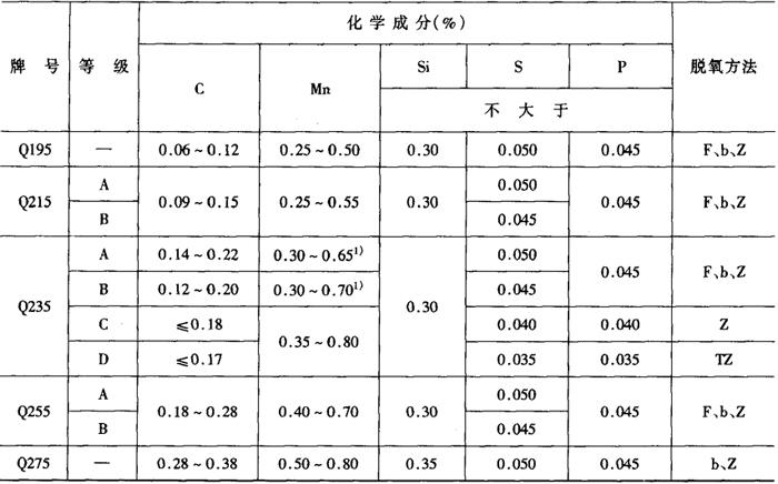 注:在GB700-79中我国将这一类碳钢根据其供货时保证条件不同分为三类: ①甲类钢(用A表示)保证力学性能,对化学成分只限硫、磷含量的上限,其余不作具体规定。 ②乙类钢(用B表示)保证化学成分,对力学性能不作具体规定。 ③特种钢(用C表示)既保证化学成分,又保证力学性能。 2.碳素结构钢的化学成分 碳素结构钢的化学成分见表2-2-2。 表2-2-2 碳素结构钢的化学成分(GB700-88)