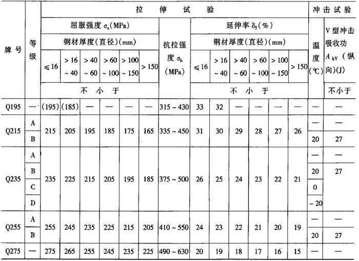 注:Q235A、B级沸腾钢锰含量上限为0.60%。 3.碳素结构钢的力学性能 表2-2-3是碳素结构钢的拉伸和冲击力学性能。表2-2-4是碳素结构钢的冷弯性能。 表2-2-3 碳素结构钢的拉伸和冲击性能(GB700-88)