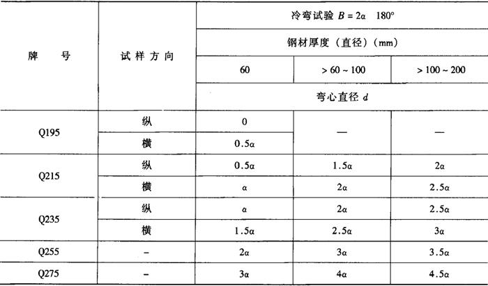 表2-2-4 碳素结构钢的冷弯性能(GB700-88)