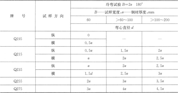 表1.1-3 碳素结构钢的牌号及弯曲性能(GB/T 700-1988)