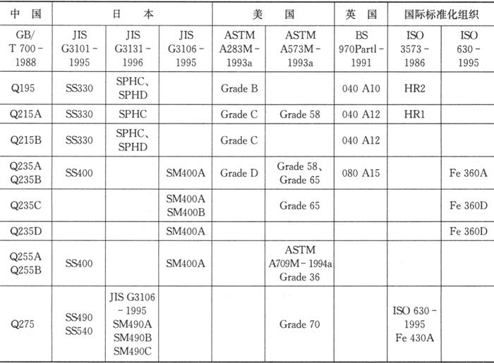 | 释义 | 碳素结构钢简介 钢的分类方法很多,按照化学成分、钢的纯度、冶炼方法、金相组织和用途的不同,可对钢进行不同的分类。我国常用的分类方法如下: 1.按化学成分分类 钢按化学成分可分为碳素钢和合金钢两大类。 (1)碳素钢 含碳量不大于2%的铁碳合金称为碳钢。根据钢中含碳量的不同,碳素钢一般还可以分为低碳钢、中碳钢和高碳钢。 低碳钢——含碳量一般不大于0.25%,主要用于建筑构件;也用于机械零部件。 中碳钢——含碳量通常在0.25%~0.60%之间,主要做机械零部件用,常常在调质状态下使用。 高碳钢——含碳量一般大于0.60%,主要作工具、弹簧及耐磨工件用,通常需经淬火处理及低温回火处理。 碳素结构钢一般属低碳钢,或含碳量在中碳钢的下限。 (2)合金钢 为了改善钢的某些性能而加入少量的一种或几种合金元素的钢。根据钢中合金元素总含量的不同,合金钢大致可分为低合金钢、中合金钢和高合金钢。 低合金钢——合金元素总含量不大于5%的钢。 中合金钢——合金元素总含量在5%~10%的钢。 高合金钢——合金元素总含量大于10%的钢。 2.按钢的纯度分类 钢按纯度可分为普通钢、优质钢和高级优质钢。 普通钢——一般含磷量不大于0.045%、含硫量不大于0.055%或者磷、硫含量均不大于0.050%。 优质钢——钢中磷、硫含量均不大于0.040%、含铜量不大于0.030%。 高级优质钢——钢中含磷量不大于0.035%、含硫量不大于0.030%、含铜量不大于0.025%。 3.按冶炼方法分类 根据冶炼设备和方法不同,可分为平炉钢、转炉钢和电炉钢。 按照钢的脱氧程度和浇注制度的不同,又可分为沸腾钢、镇静钢和半镇静钢三类。 沸腾钢——浇注前不用硅和铝脱氧,钢水中保留一定的含氧量,在钢锭模内产生沸腾现象,这类钢只限于生产碳与硅含量分别不大于0.25%与0.07%的钢种。 镇静钢——注入钢锭模前脱氧较完善,钢水在钢锭模内基本上不再产生氧化还原反应,生产的钢种不受成分限制。 半镇静钢——进行中等程度脱氧,介于镇静钢和沸腾钢之间,钢水在钢锭模内沸腾较弱,这类钢的碳含量范围比沸腾钢的宽。 我国国家标准GB/T 700-1988《碳素结构钢》适用于一般钢结构用热轧钢板、钢带、型钢、棒材,可供焊接、铆接和拴接构件用。 钢的牌号有代表屈服点的字母、屈服点数值、质量等级符号、脱氧方法等四个部分按顺序组成,以汉语拼音首位字母表示。 例如:Q235-A·F Q——钢材屈服点; 235——钢材最小屈服点(MPa); A、B、C、D——分别为质量等级; F——沸腾钢; b——半镇静钢; Z——镇静钢; TZ——特殊镇静钢。 在牌号组成表示方法中,“Z”与“TZ”符号予以省略。 表1.1-1、表1.1-2和表1.1-3列出了我国通常用于焊接构件的碳素结构钢的牌号、化学成分和力学性能。表1.1-4列出各国碳素结构钢牌号的对照。 表1.1-1 碳素结构钢的牌号及化学成分(GB/T 700-1988)