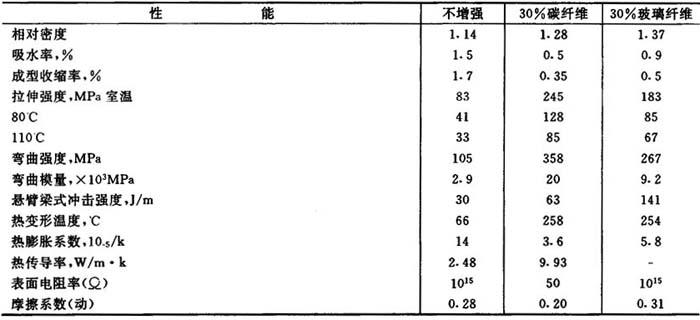 由沥青制得的高模量碳纤维,其模量虽然比聚丙烯腈碳纤维还高,但与树脂的粘合性差,用于制造增强塑料时,即使进行表面处理,材料的压缩强度和层间剪切强度也达不到聚丙烯腈碳纤维的一半,这大大限制了它的应用。在塑料工业中,碳纤维可作为热固性树脂的增强材料,如环氧树脂、酚醛树脂、不饱和聚酯等,也可用于热塑性树脂如尼龙、聚碳酸酯、ABS树脂、聚苯乙烯、聚缩醛、聚乙烯、聚丙烯等。填充量一般为10~40%。碳纤维增强塑料的主要特点是: (1)质量轻、强度高、刚性高(特别是比刚性高); (2)耐疲劳性好; (3)耐蠕变性好; (4)耐摩擦性好; (5)热膨胀性小,尺寸精度和稳定性高; (6)导电性和导热性高,但在超低温下,比玻璃纤维增强塑料小; (7)x射线透过性高,有电波遮蔽性,是非磁性体; (8)耐腐蚀性和耐热性好; (9)消振性好。 其缺点是: (1)价格高; (2)冲击强度不及玻璃纤维增强塑料; (3)层间剪切强度低(但高性能型碳纤维增强塑料与玻璃纤维增强塑料相同); (4)有电腐蚀性,特别是与铝组合使用时电腐蚀比较严重。 表14-10为碳纤维和玻璃纤维的增强效果比较。 表14-10 碳纤维和玻璃纤维缯强的尼龙66性能