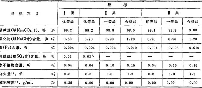 注:1)为氨碱法控制项目,用户有要求时检验。2)为包装时检验结果。 GB1886-80(食品添加剂) 本标准适用于氨碱法或联碱法制得的碳酸钠,用于食品加工工业。产品外观为白色粉状结晶。