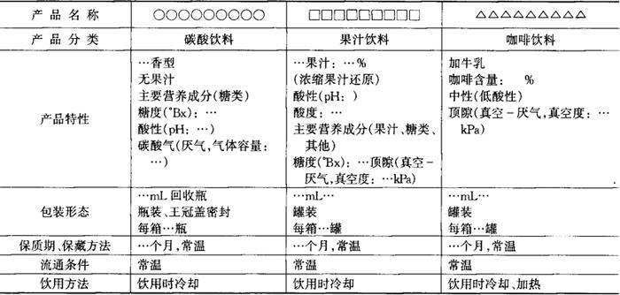 | 释义 | 碳酸饮料、果汁饮料与咖啡乳饮料的HACCP ①碳酸饮料 不杀菌,使用回收瓶以王冠盖密封,包括可乐、雪碧和果味碳酸饮料。 ②果汁饮料 金属罐装,采用最普通的热灌装方式,有柑橘、苹果等天然果汁,果汁型和果味型饮料。 ③低酸性饮料 金属罐装,例如用杀菌釜杀菌的咖啡乳饮料。 1.HACCP队的组成 HACCP队的组成是由从开始到现场有充分认识和经验,对HACCP比较熟悉的人员组成,必要时应拥有充分的权限。 2.产品特性等的记载 饮料产品的说明见表7-1-4,表中仅作一般记载。 表7-1-4 饮料产品说明
