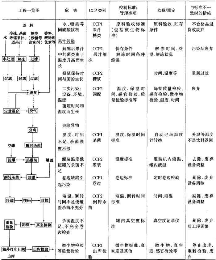 表7-1-6 果汁饮料制造工程与HACCP (金属罐装、热灌装方式)