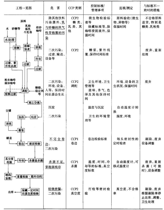 表7-1-7 中性(低酸性)饮料制造工程与HACCP (金属罐装,牛乳咖啡)
