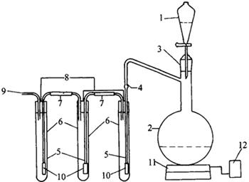 图5-3-1 二氧化碳蒸馏吸收装置 1-100mL分液漏斗 2-500mL具支圆底烧瓶 3、8-橡皮塞 4-Φ14/15磨口 5-8mm的玻璃管 6-250mm×25mm试管 7-橡皮管 9-接真空泵 10-气体分散器(具有四个孔径为0.1mm一端封死的乳胶管) 11-电炉 12-调压器:1kW (2)台式真空泵或抽气管(伽氏)。 (3)真空表:量程1~100kPa(0~760mmHg)。 (4)冰箱或冰-盐水浴。 (5)分析天平:感量0.0001g。 (五)试液的制备 将未开盖的汽水放入0℃以下冰-盐水浴(或冰箱的冷冻室)中,浸泡1~2h,待瓶内汽水接近冰冻时(勿振摇)打开瓶盖,迅速加入50%氢氧化钠溶液的上层清液(每100mL汽水加2.0~2.5mL),立即用橡皮塞塞住。将瓶底向上,缓慢振摇数分钟后放至室温,待测定。 (六)分析步骤 1.试液的蒸馏-吸收 取15.00~25.00mL上述制备好的试液(二氧化碳含量在0.06~0.15g)于500mL具支圆底烧瓶中,加入3mL10%过氧化氢和几粒多孔瓷片,连接吸收管,将分液漏斗紧密接到烧瓶上,不得漏气。预先在第一及第二支吸收管中,分别准确加入20mL0.25mol/L氢氧化钠标准滴定溶液,并将二支吸收管浸泡在盛水的烧杯中。在蒸馏吸收过程中,温度控制在25℃以下。在第三支吸收管中准确加入10mL0.25mol/L氢氧化钠标准滴定溶液及10mL氯化钡溶液。将三支吸收管串联。第三支吸收管一端连接真空泵,使整个装置密封(见图5-3-1)。打开连接真空泵的阀门,缓慢增加真空度,控制在14~20kPa(100~150mmHg),直至无气泡通过吸收管。继续抽气,使其保持真空状态,将35mL酸性磷酸盐溶液加入分液漏斗中,打开活塞,使酸性磷酸盐溶液缓慢滴入烧瓶中(约30mL),关闭活塞。摇动烧瓶,使样品与酸液充分混合,用调压器控制电炉温度,缓慢加热,使二氧化碳逐渐逸出,控制吸收管中有断断续续气泡上升。待第一支吸收管中约增加2~3mL馏出液,吸收管上部手感温热时,即表明烧瓶内的二氧化碳已全部逸出,并被吸收管内氢氧化钠所吸收。此时关闭第三支吸收管与真空泵之间的连接阀,关闭电炉,慢慢打开分液漏斗的活塞,通入空气,使压力平衡。将三支吸收管中的溶液合并洗入500mL锥形瓶中,并用少量水多次洗涤吸收管,洗液并入锥形瓶中,加入50mL氯化钡溶液,充分振摇,放置片刻。 2.滴定 在上述锥形瓶中,加入3滴(约0.15mL)酚酞-百里酚酞指示液,用0.25mol/L盐酸标准滴定溶液滴定至溶液为无色。记录消耗盐酸标准滴定溶液的毫升数(V3)。 (七)分析结果表述 按式(3)计算样品中二氧化碳的含量,以质量百分率表示。
