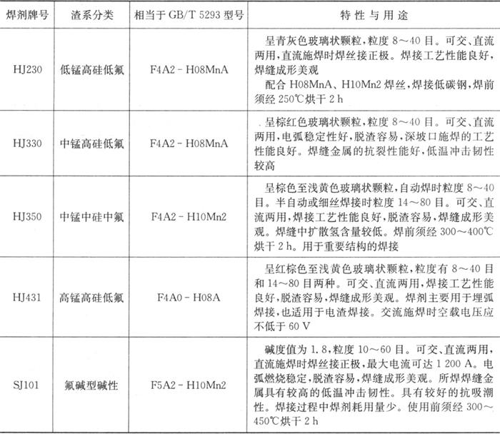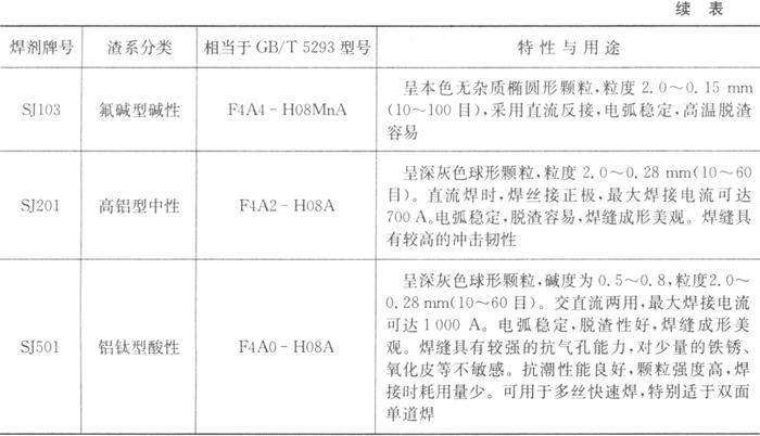 表1.5-12列出了埋弧焊常用碳钢焊剂的牌号、特性和用途。 表1.5-12 埋弧焊常用碳钢焊剂的牌号、特性和用途