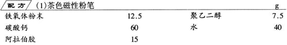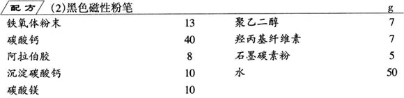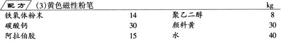 制法 先将阿拉伯胶溶于水中,搅拌均匀后将其与其余全部组分混合,搅拌1~2h后,在70℃下干燥0.5h,再用挤压机将原料成型,即得黄色磁性粉笔。 |