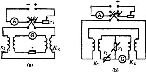 图6.6-11 磁通比较装置线路:a)差值法,b)零值法 KΦX=KΦS+Cα/△I (6.6-13) 式中,KΦX和KΦS分别为被检和标准量具的磁通常数,C为冲击检流计常数,△I为初级绕组回路电流的变化量。在差值法中,影响比较准确度的主要因素是冲击检流计的灵敏度和其常数的准确度,因此,被比较的两个量具的常数相差越小,比较精度就越高。 零值法用于不同名义值磁通量具之间的比较,其线路如图6.6-11b)所示。ΦS和ΦX的次级绕组接成桥路,调节电阻r1和r2使得改变初级绕组电流方向时,检流计G不再发生偏转,这时