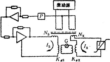 式中rΦS为标准量具ΦS的次级绕组的铜阻。零值法的比较精度主要取决于电阻比r1/(r1+r2+rΦS)的测量准确度。当用0.02%的电桥测量r1和(r1+r2+rΦS)时,只能得到0.05%左右的比较精度。 为避免零值法中电阻比测量精度不高的问题,可采用直流电流比较仪确定流过标准和被测量具初级绕组的两电流之比的方法,来实现磁通量具的相互比较(见图6.6-12)。电流比较仪的基本公式为:
