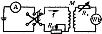图6.6-12 采用直流电流比较仪比较磁通量具的线路 IXNX=ISNS (6.6-15) 调节适当的匝数比,使恒流源反向时(电流IX反向,IS由伺服系统控制自动反向),检流计G指零,则有 IXKΦX=ISKΦS (6.6-16) 将(6.6-15)式代入(6.6-16)式,可得 KΦX=(Nx/Ns)KΦS (6.6-17) 由于电流比较仪的匝数比(NX/NS)的准确度可做到10-7以上,因此其比较精度主要由系统的磁通灵敏度决定。当检流计灵敏度足够时,无论是对同名义值的比较,还是对不同名义值的比较,该法均能达到优于0.01%的准确度。 直接测量指针偏转的感应冲击法是用冲击检流计直接测量被检量具在初级电流反向时次级绕组所感应的电流脉冲。这时,标准量具只是用于对冲击检流计进行刻度,被检量具的常数按下式计算: KΦX=Cα/△I (6.6-18) 这种方法的准确度有限,仅在测量等级较低的工作量具常数时使用。 2.磁通表的检定 磁通表的基本误差,可用被检表直接测量磁通互感量具绕组中所耦合磁通的方法进行测定。测量线路如图6.6-13所示。用互感线圈作标准量具,其初级绕组的电流,根据被检表刻度的磁通实际值,按公式I=Φ0/M(当切断电流时)或I=Φ0/2M(当电流换向时)进行计算和调整。磁通表的基本允许误差取决于外回路的电阻,该电阻值在技术条件里一般都有规定,因此在检定时应通过调节电阻箱Rp使被检表的外回路电阻满足规定值。