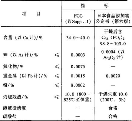 | 释义 | 磷酸三钙 别名 磷酸钙、沉淀磷酸钙 编码 GB 02.003;INS 341(iii) 化学结构 为不同磷酸钙组成的混合物,大约组成为10CaO·3P2O5·H2O。一般通式为Ca3(PO4)2,相对分子质量310.18。 性状 白色粉末,无臭,无味,在空气中稳定,相对密度约3.18,熔点1670℃,难溶于水(100g水中约可溶解0.0025g,在含二氧化碳的水中溶解度稍高),不溶于乙醇,易溶于稀盐酸和硝酸。 制法 (1)由氯化钙与磷酸钠反应制得。 (2)由熟石灰与磷酸反应制得。 质量标准
