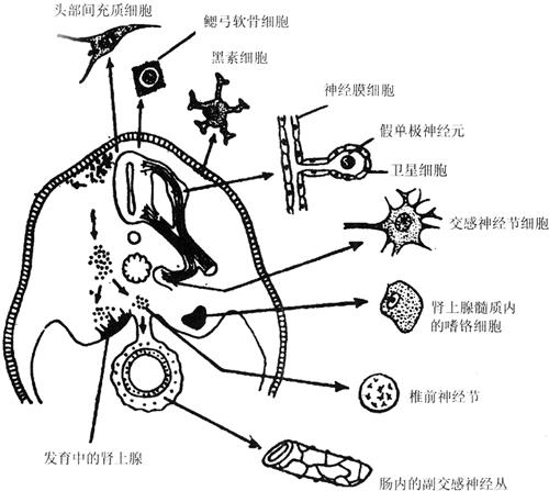 | 释义 | 神经嵴的发育 当神经管形成时,神经沟缘部分细胞脱离神经管,集聚于神经管两侧上方,成为两条纵行细胞索,叫神经嵴(neural crest)。随后,神经嵴的细胞向胚体多处迁移,可分化形成脑脊神经节与周围神经。部分神经嵴细胞迁移分化为肾上腺髓质、皮肤黑素细胞及某些APUD系细胞等。头部神经嵴细胞形成腮弓内的间充质,以后分化为头面部的软骨细胞、骨细胞、肌细胞、成牙质细胞等(图2-9)。