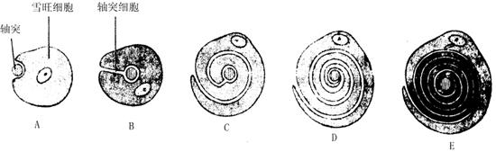 图2-10 神经膜细胞形成髓鞘(A~E.示周围神经纤维由雪旺氏细胞形成髓鞘的过程。轴突先嵌入雪旺氏细胞内,当轴突系膜(即凹部位细胞膜)伸长,雪旺氏细胞缠绕轴突,各层细胞膜之间的胞质浓缩,在髓鞘外周保留有细胞质) |
