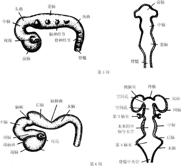 | 释义 | 神经管的形成和组织分化 一、神经根管的形成 神经轴的器官发生最主要的为外胚层单层细胞,先形成神经管,以后发展为脑及脊髓。器官发生包括:①神经管的闭合;②神经管的横行分节;③神经管壁的分层;④神经管的屈曲;⑤一些部分突出,如小脑、橄榄体等;⑥大、小脑沟、裂形成;⑦已形成部分继续增大。 神经器官发生最先在胎盘背侧矢状面出现原裂及原结,以后在中线出现原沟,两侧为神经褶。最初先在下颈部及上胸部相接触,以后向头、尾侧闭合,而使神经管与外胚层表面其余部分隔开。神经管头、尾侧最后闭合,形成前、后神经孔,从单一细胞层转为多层直至完全闭合。当神经管闭合时其周围众多的多能的前体细胞经过多次分裂而定向分化为成神经细胞或某一种成胶质细胞。也有些来自神经嵴。胎儿期后,脑室周围细胞失去产生新成神经细胞或成胶质细胞的能力,但某些神经胶质细胞如星形胶质细胞仍具有增殖能力,室间膜细胞为成熟型,只有很小增殖能力。 二、神经根管的形态分化 胚胎第4周末,神经管头段形成3个膨大,即脑泡(brain vesicle),由前向后分别为前脑泡、中脑泡和菱脑泡。至第5周时,前脑泡的头端向两侧膨大,形成左右两个端脑(telencephalon),以后演变为大脑两半球,而前脑泡的尾端则形成间脑。中脑泡变化不大,演变为中脑。菱脑泡演变为头侧的后脑(metencephalon)和尾侧的末脑(myelencephalon),后脑演变为脑桥和小脑,末脑演变为延髓。神经管的后段较细,衍化为脊髓(图2-1)。