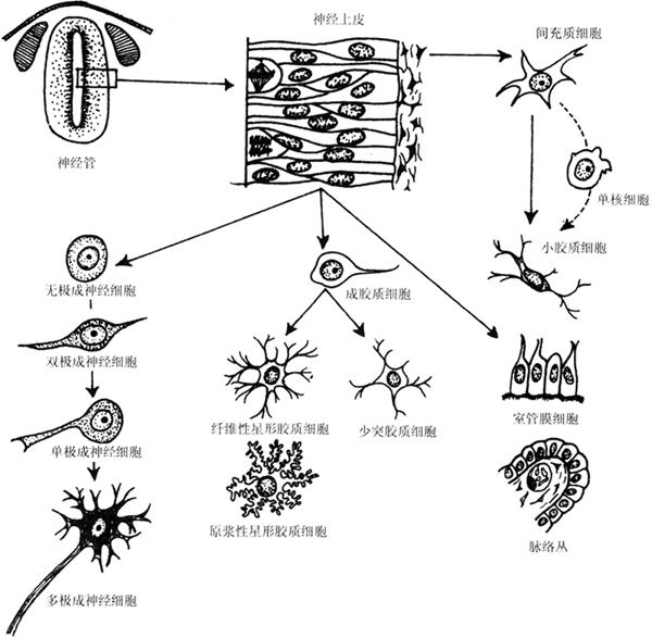 图2-2 神经管上皮早期分化 成神经细胞属分裂后细胞,一般不再分裂增殖,起初为圆形,称无极成神经细胞(apolar neuroblast),以后发生两个突起,成为双极成神经细胞(bipolar neuroblast)。双极成神经细胞朝向神经管腔一侧的突起退化消失,成为单极成神经细胞(unipolar neuroblast);伸向边缘层的一个突起迅速增长,形成原始轴突。单极成神经细胞内侧端又形成若干短突起,成为原始树突,于是成为多极成神经细胞(multipolar neuroblast)。 在神经元的发生过程中,最初生成的神经细胞的数目远比以后存留的数目多,那些未能与靶细胞或靶组织建立连接的神经元都在一定时间死亡。这说明神经元的存活与其靶细胞或靶组织密切相关。近年来的研究发现,神经细胞的存活及其突起的发生主要受靶细胞和靶组织产生的神经营养因子的调控,如神经生长因子(NGF)、成纤维细胞生长因子(FGF)、表皮生长因子(EGF)、胰岛素样生长因子(IGF)等。大量神经元的生理性死亡,与这些细胞不能获得靶细胞或靶组织释放的这类神经营养因子密切相关。 神经胶质细胞的发生晚于神经细胞。成神经胶质细胞首先分化为各类胶质细胞的前体细胞,即成星形胶质细胞(astroblast)和成少突胶质细胞(oligodendroblast)。然后,成星形胶质细胞分化为原浆性和纤维性星形胶质细胞,成少突胶质细胞分化为少突胶质细胞。最近有人在体外培养的研究中发现,两种星形胶质细胞分别由两种不同的前体细胞分化而来,少突胶质细胞与纤维性星形胶质细胞来自同一种前体细胞。也有人提出,少突胶质细胞并非来自神经上皮细胞,而是来自神经管周围的间充质。对于小胶质细胞的起源问题,至今尚有争议,有人认为这种胶质细胞来源于神经管周围的间充质细胞,更多人认为来源于血液中的单核细胞(图2-3)。神经胶质细胞始终保持分裂增殖能力。