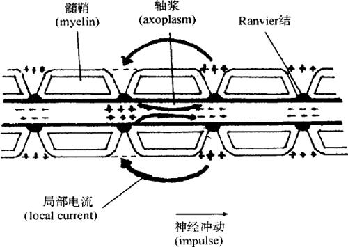 | 释义 | 神经纤维 神经纤维(nerve fiber)是指神经元的轴突,其基本功能是传导神经冲动。传出神经纤维除了将神经冲动快速传至所支配的效应器并调节其活动外,还可对所支配的组织产生持久的营养作用。 (一)神经纤维的分类 根据神经纤维直径大小,可将其分为Ⅰ、Ⅱ、Ⅲ、Ⅳ类。也可根据电生理学(electrophysiology)特性及冲动在神经纤维上传导的速度分为A、B、C三大类。A类指有髓鞘(myelinated)躯体传入和传出纤维,直径为1~22μm,传导速度为12~120m/s。根据平均传导速度,A类纤维还可分为α、β、γ、δ四类。B类指有髓鞘的植物性神经节前纤维,直径1~3μm,传导速度低于15m/s。C类包括无髓鞘(unmyelinate)躯体传入纤维和自主神经节后纤维,直径0.3~1.3μm,传导速度低于2.3m/s。 (二)兴奋在神经纤维上的传导 1.无髓鞘神经纤维兴奋部位(即产生动作电位部位) Na+由膜外快速内流,造成膜表面电位降低,而邻近未兴奋部位电位升高,因此,兴奋部位与安静部位之间形成了小的局部电流(local current)。其电流方向,在细胞膜表面是由安静部位流向兴奋部位,但在神经纤维内则方向相反。在膜内,这个电流可提高未兴奋的邻近膜内电位。当安静部位膜内电位不断上升,达到阈电位(threshold potential)水平时,即可打开电压依赖式的Na+通道,使安静部位产生动作电位(action potential),兴奋就由一处传到另一处了。这种在神经纤维上传导的动作电位即神经冲动(nerve impulse)。 2.兴奋传导的速度 有髓鞘的神经纤维的兴奋传导速度要比无髓鞘纤维快许多。这是由于有髓鞘纤维的轴突外面包裹着不导电的髓鞘,局部电流不易穿过,只能在无髓鞘包裹的郎飞节处发生刺激。因此,局部电流只能在已兴奋的郎飞节跃到与其相邻的未兴奋的郎飞节之间产生,引起相邻郎飞节处爆发动作电位。由此可见,兴奋在有髓神经纤维上的传导是跳跃式传导(saltatory conduction)(图12-95)。