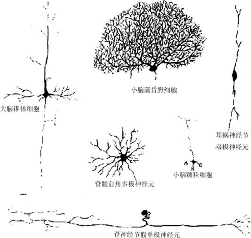 图4-1 脂质双层液态镶嵌模型 2.细胞质 细胞质内含有许多细胞器,包括线粒体、高尔基体、溶酶体等,但较为特殊的是尼氏体(Nissel’s body)和神经原纤维(neurofibril)。尼氏体只存在于胞体和树突中,而在轴突和轴丘中没有观察到。尼氏体由糙面内质网和核糖核蛋白体所组成,是神经元内合成蛋白质的主要部位。神经原纤维为成束排列的细束,由直径不等的神经微管和微丝组成:有的在胞体中交织成网,有的在轴突中和树突中彼此平行,密集成束。神经原纤维的功能可能是起细胞骨架的作用和协助轴浆运输物质。 3.细胞核 细胞核一般位于神经细胞的中央。每个神经细胞有一个核,核内含有由DNA和有关蛋白质组成的遗传物质。细胞核的大小与神经元的大小有关。细胞核核膜的组成和质膜的组成基本是一样的。在核膜上有许多孔洞,称为核孔。一方面,在细胞核内转录成的mRNA、rRNA等要离开核,转移到胞质;另一方面,合成这些物质的原材料来自胞质。所以核孔内有双路运输的穿梭。核内也有一些受体,协助类固醇类激素起生理作用。核内的DNA有两种作用:一是可复制自身,进行细胞分裂;另一个作用是作为模板,制造神经元所需要的各种不同的功能蛋白质。 (二)神经元的突起 神经元的突起分为两种类型:一种是树突(dendrite),另一种是轴突(axon)。 1.树突 树突是胞体向外生长的树状突起,其内容物和胞体大致相同。树突的基部较宽,向外生长时反复分支和不断变细,一般较短。在树突的小分支上有大量的细刺状突起,称为“棘”,是和其他神经元具有机能性连接的部位。一个神经元的胞体可发出许多根树突。树突接受其他神经元来的信息,在胞体综合后,从轴突传向下一级神经元。信息也可以在树突这一层次进行传递,即由树突接受信息,然后从树突传出,而不必从轴突或胞体传出。作为接受信息的树突终末,在许多感觉器官中会和特化的结构相结合,组成感受器。 2.轴突 神经元的胞体只发出一根轴突,胞体发出轴突的部位称为轴丘。轴丘是动作电位产生的部位。刚从胞体发出的轴突无髓鞘包裹,随后整个轴突都由髓鞘所包裹。在中枢神经系统中,髓鞘是由无突胶质细胞形成。在周围神经系统中,髓鞘是由雪旺氏细胞(Schwann cell)形成。轴突的粗细在全长是均匀一致的。在轴突的主干上,常可向直角方向发出侧支。轴突内的胞浆称为轴浆,它与胞体的神经浆相连,存在着双向流动,称为轴浆流,起着物质运输的作用。由于轴突中不存在尼氏体,所以不能合成蛋白质。新的蛋白质由胞体合成,再向轴突方向运输。而轴突的代谢产物,则由轴突向胞体方向运送。 轴突的末端脱去髓鞘后反复分支。每一个分支的末端膨大,称为突触前终末。这是神经元之间传递信息的装置。突触前终末和另一个细胞的树突或胞体等相接触的部位,称为突触。发出信息的神经元称为突触前细胞,而接受信息的神经元称为突触后细胞。 (三)神经元的分类 1.根据形态分类 神经元胞体的形状和突起的长短、数量是多种多样的。一般根据神经元突起的数目将神经元分为单极神经元、双极神经元和多极神经元3种。单极神经元或称假单极神经元,从胞体只伸出一根突起,突起离开胞体后不久再分为轴突(中枢突)和树突(周围突)。例如,脊神经节中的细胞均属此类。树突接受外界的刺激信号,向胞体传送信息,经胞体整合后由轴突传向下一级神经元。双极神经元多为梭形,从胞体的两端各发出一根突起。如视网膜中的双极神经细胞属于此类。多极神经元是由胞体发出两根以上的突起,其中一根为轴突,长而细;其余的为树突,而且一根树突又有许多分支,中枢神经系统内的神经元多属此类。 另一种形态分类是按照轴突的长短,把神经元分为高尔基Ⅰ型和高尔基Ⅱ型。前者是轴突细长、连接范围较广的神经元;后者轴突甚短,仅与邻近的神经元连接。大脑皮层的锥体细胞属于前者,而星形细胞属于后者。此外还有一些特殊的神经元,如无足细胞没有明显的轴突,存在于视网膜等处(图4-2)。