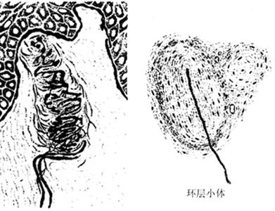 图4-3 神经末梢的结构 2.有被囊神经末梢 有被囊神经末梢(encapsulated nerve ending)外面均包裹有结缔组织被囊,它们的种类很多,常见的有如下几种: (1)触觉小体(tactile corpuscle):又称Meissner小体,分布在皮肤真皮乳头内,以手指、足趾的掌侧的皮肤居多,感受触觉,其数量可随年龄增长而减少。触觉小体呈卵圆形,长轴与皮肤表面垂直,外包有结缔组织囊,小体内有许多横列的扁平细胞。有髓神经纤维进入小体时失去髓鞘,轴突分成细支盘绕在扁平细胞间(图4-4)。