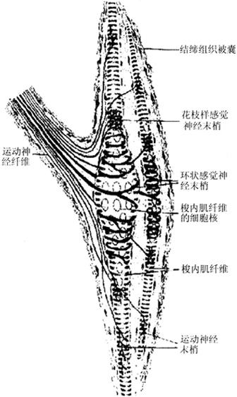 图4-4 触觉小体的结构 (2)环层小体(lamellar corpuscle):又称Pacinian小体,体积较大(直径1~4mm),卵圆形或球形,广泛分布在皮下组织、肠系膜、韧带和关节囊等处,感受压觉和振动觉。小体的被囊是由数十层呈同心圆排列的扁平细胞组成,小体中央有一条均质状的圆柱体。有髓神经纤维进入小体失去髓鞘,裸露轴突穿行于小体中央的圆柱体内(图4-4)。 (3)肌梭(muscle spindle):是分布在骨骼肌内的梭形小体,长约1~7mm,外有结缔组织被囊,内含若干条细小的骨骼肌纤维称梭内纤维(intrafusal muscle fiber)。梭内肌纤维的中段肌浆较多,肌原纤维较少,有些肌纤维的细胞核排列成串,有些肌纤维的细胞核聚集在中段而使中段膨大。感觉神经纤维进入肌梭时失去髓鞘,其轴突细支呈环状包绕梭内肌纤维的两端。肌梭是一种本体感受器,主要感受肌纤维的伸缩变化,在调节骨骼肌的活动中起重要作用(图4-5)。