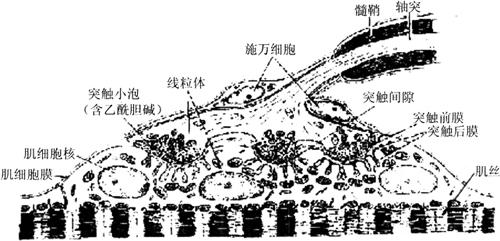 图4-5 肌梭的结构 (二)运动神经末梢 运动神经末梢(motor nerve ending)是运动神经元的长轴突分布于肌组织和腺内的终末结构,支配肌纤维的收缩和腺的分泌。神经末梢与邻近组织共同组成效应器(effector)。运动神经末梢又分躯体和内脏运动神经末梢两类。 1.躯体运神经末梢 躯体运动神经末梢(somatic motor nerve ending)分布于骨骼肌内。神经元的胞体位于脊髓灰质前角或脑干,轴突很长,离开中枢神经系统后成为躯体传出(运动)神经纤维,其中小部分细有髓神经纤维供应肌梭内的梭内肌纤维,其余大部分粗有髓神经纤维均分布于骨骼肌(梭外肌)。有髓神经纤维抵达骨骼肌时失去髓鞘,其轴突反复分支,每一分支形成葡萄状终末与一条骨骼肌纤维建立突触连接,此连接区域呈椭圆形板状隆起,称运动终板(motor end plate)或神经肌连接(neuromuscular junction)。 一条有髓运动神经纤维支配的骨骼肌纤维数目多少不等,少者1~2条,多者可分支支配上千条;而一条骨骼肌纤维通常只有一个轴突分支支配。一个运动神经元的轴突及其分支所支配的全部骨骼肌纤维合称一个运动单位(motor unit)。在电镜下,运动终板处的肌纤维含丰富的肌浆,有较多的细胞核和线粒体,肌纤维表面凹陷成浅槽,突终末嵌入浅槽内(图4-6)。槽底肌膜即突触后膜,又凹陷成许多深沟和皱褶,使突触后膜的表面积增大。突触后膜上有乙酰胆碱N型受体。轴突终末与肌膜之间的间隙为突触间隙,与肌膜相对的轴膜是突触前膜,它富含电位门控钙通道。轴突终末内有大量圆形突触小泡,内含神经递质乙酰胆碱,还有许多线粒体和一些微管、微丝等。当神经冲动到达运动终板,轴突终末突触前膜上的电位门控钙通道开放,Ca2+进入轴突终末内,促使突触小泡移附于突触前膜,并藉出胞作用释放其内的乙酰胆碱到突触间隙。大部分乙酰胆碱分子与肌膜(突触前膜)上的乙酰胆碱N型受体结合,引起与受体偶联的化学门控钠通道开放,大量Na+进入肌浆内,使肌膜两侧离子分布发生变化而产生兴奋,从而引起肌纤维的收缩。