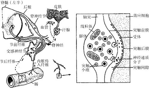图4-7 内脏运动神经末梢示意图 根据末梢膨体内突触小泡释放神经递质的不同,可把内脏运动神经纤维分为胆碱能纤维、肾上腺素能纤维和肽能纤维。所有节前纤维都属胆碱能纤维,节后纤维则因交感神经和副交感神经而不同。交感神经的节后纤维是肾上腺素能纤维或肽能纤维,或一种纤维既是肾上腺素能又是肽能的;副交感神经的节后纤维则是胆碱能纤维或肽能纤维,或一种纤维既是胆碱能的又是肽能的。与内脏运动神经末梢膨体接触的效应的细胞膜(突触后膜)上有相应的神经递质的不同类型受体,膨体释放的神经递质与不同类型受体结合,可引起效应细胞不同的生理反应。 四、神经胶质细胞 中枢神经系统中存在着大量的非神经元细胞,即神经胶质细胞(neuroglia)。在哺乳类动物的大脑中,神经胶质细胞的数量约为神经细胞的10~50倍。它们在中枢神经系统内部构成部分实质,并衬在脑室系统的壁上;在周围神经系统,它们是包裹神经纤维的雪旺细胞及感觉上皮的支持细胞。神经胶质细胞的体积一般比神经细胞小,虽然其数量巨大,但其总的体积只占脑体积的一半。人们对胶质细胞的形态、结构、功能和电生理特性等进行了大量的研究。在普通染色的标本上,只能看见到它们的细胞核,用镀银法可见细胞突起。神经胶质细胞分为星形胶质细胞、少突胶质细胞、小胶质细胞、室管膜细胞等。 (一)神经胶质细胞的几种类型 (1)星形胶质细胞:星形胶质细胞是胶质细胞中体积最大的细胞,它为星状,其突起呈树枝状,不分树突和轴突。突起的末端膨大,包裹在脑毛细血管的表面,称为血管周足(也称脚板)。而其他胶质细胞的突起则附于神经细胞的胞体和树突上。脑毛细血管表面有85%以上的面积被血管周足所包绕,这些解剖结构被认为可能是血-脑脊液屏障的结构基础。根据胞质内原纤维量的多少,星形胶质细胞分为原浆性及纤维性两种。前者有很多分支的粗突起,胞质内原纤维较少,核染色略浅,主要分布在灰质,常沿神经元的胞体排列,并以突起包绕神经元的胞体;后者有较少分支的细长突起,胞质内原纤维多,核染色较深,主要分布在白质。在脑或脊髓的灰质和白质邻接地区,有混合型的原浆纤维性星形胶质细胞,它延伸到白质中的突起为纤维性的,而到灰质中的突起是原浆性的。 (2)少突胶质细胞:少突胶质细胞因突起少而得名。分布在灰、白质中。在白质神经纤维束间的少突胶质细胞称束间细胞,常在纤维束间排列成行。在胎儿及新生儿中,此种细胞较多,它们包绕轴突形成髓鞘,以后突起迅速减少。位于灰质中的少突胶质细胞称为神经元周细胞,是卫星细胞之一,其突起紧贴神经元或靠近树突,在较大的神经细胞如大脑皮层的大锥体细胞旁较多。少突胶质细胞在中枢神经系统中包裹神经元的轴突形成髓鞘;有的轴突没有髓鞘,则被单层的少突胶质细胞所覆盖。 (3)小胶质细胞:小胶质细胞体积最小,核呈长形或三角形,染色质均匀分布,着色较深,有少量细胞质,突起少且较粗短,有分支,其上有大量棘刺。此细胞常分散地广泛分布于脑和脊髓,但在灰质内居多。其突起伸入神经元间,也可延展到毛细血管表面,构成神经元和血管的卫星细胞。在侧脑室的室管膜下层,也有较多小胶质细胞。电镜观察发现其细胞质中的内质网少,不含胶质微丝,故易与星形胶质细胞区别,但很难确切鉴别它们。有人认为它和少突胶质细胞可能是同一种细胞,并由后者变异而来。在中枢神经系统受到损伤或有炎症时该细胞增多。小胶质细胞的功能是:当神经元发生病变(如出现髓鞘变性)时,小胶质细胞具有吞噬作用,能清除这些病变的细胞。 (4)室管膜细胞:室管膜细胞衬在脑室系统及脊髓中央管的壁上,又称室管膜上皮细胞。室管膜细胞除具有支持作用外,在正中隆突及垂体柄处,还与向脑脊液中分泌或摄取、转运某些激素控制因子有关。在其他部位,室管膜细胞的基底面的短突起可以附着于血管壁,参与脑脊液和血液间的物质运输。 (二)神经胶质细胞的功能 (1)支持、绝缘、保护和修复作用:星形胶质细胞填充在神经元间,它的长突起附着在血管壁及软脑膜上,起着机械性的支架作用。雪旺氏细胞和少突胶质细胞包绕轴突(或长树突)形成髓鞘,后者在神经纤维传导冲动时具有绝缘作用。胶质细胞包围单个或成群神经元,使之彼此分隔,也起着绝缘作用。电镜研究证实,即使是在突触附近,仍有胶质细胞突起,只有突触除外,这就保证了神经冲动的传导不受到干扰。小胶质细胞在正常动物脑中并不活跃,但是在炎症或变性过程中,它迅速增殖,迁移至损伤地区,细胞变圆变大,成为活跃的吞噬细胞。同时,少突和星形胶质细胞也发生反应,体积膨大,胶质微丝明显,脚板膨大,溶酶体增多。有人认为这两种细胞与损伤细胞碎片的被吞噬有关。胶质细胞在损伤处增生,填充空隙形成疤痕。在周围神经纤维断裂时,雪旺氏细胞吞噬溃变的轴突和分解的髓鞘,同时细胞增殖,在断裂处形成细胞桥,将纤维的两断端连接,提供了再生轴突芽生长的通道,而且形成新的髓鞘。 (2)营养和物质代谢作用:在脑组织中的大部分毛细血管的表面,都有星形胶质细胞的脚板与之紧密相贴,其间仅隔一层基膜。这样一方面可起着屏障作用,另一方面也可以转运某些代谢物质。目前已知在血管脚板上或基膜上有一些酶,它们对于向神经元运送糖原起着一定的