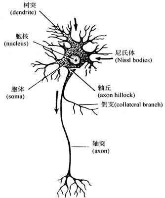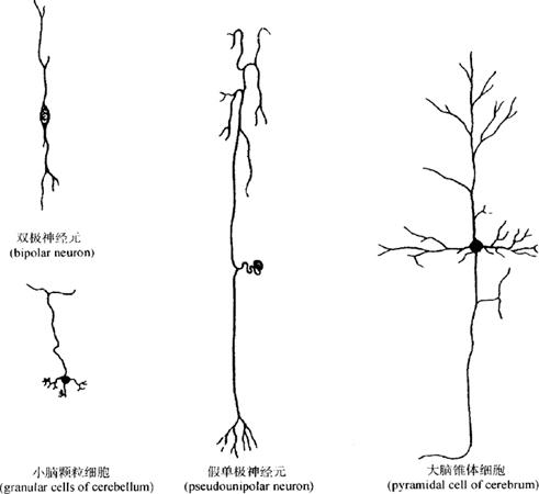 | 释义 | 神经组织 神经组织(nerve tissue)构成神经系统,分为中枢神经系统和周围神经系统。神经组织由神经细胞(nerve cell)和神经胶质细胞(neuroglial cell)组成。神经细胞又称神经元(neuron),人的神经系统含有上百亿个神经元,是神经系统的基本结构和功能单位,有感受刺激和传导兴奋的功能。神经元的胞体主要分布在中枢神经系统,如大脑皮质、小脑皮质、脊髓的灰质以及周围神经系统的神经节等;神经元的突起则组成中枢神经系统的神经通路和神经网络以及遍布全身的神经。神经胶质细胞(neuroglial cell)广泛分布于中枢和周围神经系统内的神经元胞体之间和突起之间,起支持、营养和保护神经元的作用。 (一)神经元 1.神经元的形态与结构 神经元形态多样。由胞体(soma)和突起(neurite)两部分组成(图2-44)。神经元的细胞膜与普通细胞膜一样由镶嵌有蛋白质的脂质双分子组成。膜内有通道、载体和受体蛋白等,在神经元感受刺激和传导兴奋中起到重要作用。膜表面有糖链组成糖蛋白和糖脂,与细胞识别和连接有关。同时膜内外也与其他细胞一样维持有一定的电位差(膜电位),即膜外带正电荷,膜内带负电荷,呈极化(polarization)状态。当神经细胞膜受刺激时,膜电位发生改变后又很快复原,此过程称为动作电位(action potential),可沿细胞膜扩布,即形成神经冲动的传导。