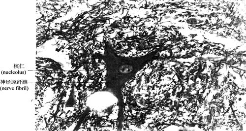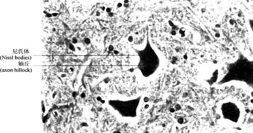 图2-44 多极神经元模式图 (1)胞体:神经元胞体是细胞的营养中心,细胞核位于胞体中央,大而圆,染色浅,核仁明显。胞质称核周质(perikaryon),含有发达的粗面内质网、游离核糖体、高尔基复合体和微丝、微管、神经丝等。在光镜下,粗面内质网和游离核糖体呈嗜碱性颗粒或块状,称为尼氏体(Nissl bodies)(图2-45),主要功能是合成蛋白质(包括合成神经递质有关的蛋白质和酶)。直径约为10nm的神经丝(neurofilament)常集合成束,在胞体内交织成网,伸入突起内则平行排列,在银染切片中呈棕黑色细丝,称为神经原纤维(图2-46),对神经元起支持、传递信息和运输等作用。某些神经元胞体含有分泌颗粒,内含激素,具有内分泌功能,称为分泌神经元(secretory neuron)。