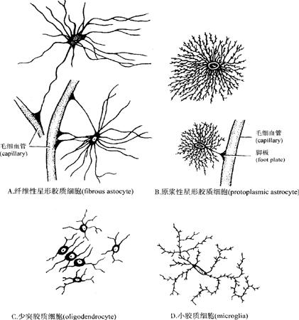 图2-47 神经元分类示意图 (2)按神经元功能可分为:①感觉神经元(sensory neuron)(传入神经元,afferent neuron):主要与感受器相连,将刺激传向中枢;②运动神经元(motor neuron)(传出神经元,efferent neuron):将神经冲动传到效应器官;③联合神经元(中间神经元,interneuron):位于前两者之间,起联络作用,多位于中枢,亦为多极神经元。 (二)神经胶质细胞 神经胶质细胞(neuroglial cell)简称胶质细胞(glial cell),数量约为神经元的10倍,但因其比神经元小,在常规染色标本中只见到细胞核,以金属浸镀技术(metallic impregnation technique)可观察到胶质细胞整体形态。胶质细胞也有突起,但胞体内无Nissl bodies,胞突无树突轴突之分,无传导神经冲动的功能。其主要作用是对神经元有支持、营养、修复、分隔绝缘及形成髓鞘等功能,对神经系统发育和正常生理活动有重要作用。神经胶质细胞可分中枢神经系统胶质细胞(图2-48)和周围神经系统胶质细胞两类。