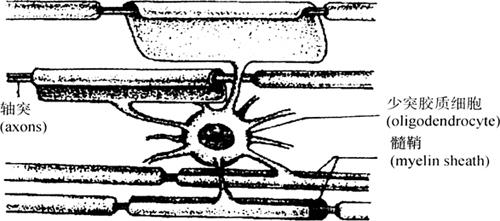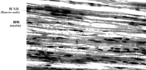 图2-50 周围有髓神经纤维(纵切面)(400×) 中枢神经系统有髓神经纤维的髓鞘由少突胶质细胞的突起末端呈扁平薄膜状包绕轴突形成(图2-51)。一个少突胶质细胞的多个突起可分别包卷多条轴突。但髓鞘外没有基膜,也没有Schmidt-Lantermann incisure。