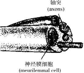 图2-51 中枢神经纤维髓鞘形成模式图 2.无髓神经纤维(amyelinated nerve fiber) 周围神经系统无髓神经纤维由Schwann cell一个接一个连续包裹细轴突形成,但包膜不发生反复包卷,故不形成髓鞘,也无郎飞结。一个Schwann cell可包绕多条轴突(图2-52)。中枢神经系统无髓神经纤维为裸露的轴突,常与有髓神经纤维混杂一起。无髓神经纤维因无髓鞘和郎飞结,其神经冲动是沿轴突连续传导,故传导速度较慢。