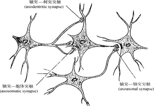 图2-52 无髓神经纤维模式图 (四)突触 突触(synapse) 是传递信息的重要结构。它是神经元与神经元之间,或神经元与非神经细胞之间的一种特化的细胞连接。常见的是一个神经元的轴突终末与另一个神经元的胞体或树突连接,构成轴-体(axosomatic)、轴-树(axodendtitic)突触(图2-53)。根据突触传导信息的方式,主要分为以释放神经递质传导冲动的化学性突触(chemical synapse)和通过缝隙连接的低电阻传导冲动的电突触(electric synapse)两种,并以化学性突触多见。