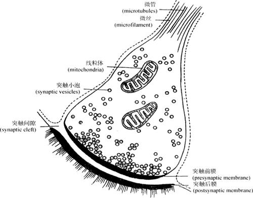 图2-53 各种突触示意图 化学性突触由突触前成分(presynaptic element)、突触间隙(synaptic cleft)和突触后成分(postsynaptic element)组成(图2-54)。突触前、后成分彼此相对的细胞膜分别称为突触前膜(presynaptic membrane)和突触后膜(postsynaptic membrane)。突触前成分通常为轴突终末膨大,呈环扣状附在另一神经元的胞体或树突上,称突触扣结(synaptic bouton),内含较多突触小泡(synaptic vesicle)。小泡表面有一种磷蛋白(phosphopratein),称突触素Ⅰ(synapsin Ⅰ),其磷酸化时可使小泡脱落,顺细胞骨架移到突触前膜并与之融合,释放出神经递质。突触前膜有电位门控通道(是一种由膜蛋白构成的钙通道)。突触间隙是突触前、后膜之间的间隙,宽约20~30nm。突触后成分主要为突触后膜及其受体和化学门控通道。