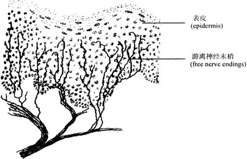 图2-54 化学性突触超微结构模式图 突触传导神经冲动是沿轴膜到达突触前膜,由冲动所导致的膜内外电位逆转(即俗称去极化,depolarization)使电压门控钙通道(voltage-gatad calcium channel)开放,细胞外钙离子进入突出前成分,在ATP参与下使突触素Ⅰ发生磷酸化,促使突触小泡移附在突触前膜上,以胞吐作用释放神经递质(neurotransmiffer)进入突触间隙,神经递质与突触后膜的受体结合,引起突触后膜上的化学门控通道开放,使相应的离子进出,此离子流使突触后膜电位逆转(去极化),产生第二次神经冲动。突触后膜神经冲动的发射是数百个突触一起作用后的结果。神经递质可在突触接合后产生兴奋(excitation)或抑制(inhibition)作用。使突触后膜发生兴奋的突触称为兴奋性突触(excitatory synapse),使突触后膜发生抑制的突触称为抑制性突触(inhibitory synapse)。 (五)神经末梢 神经末梢(nerve ending)是指周围神经纤维轴突的终末部分。按其功能可分接受体表和内脏感觉的感觉神经末梢(sensory nerve ending)和支配肌肉或腺体等效应器官的运动神经末梢(motor nerve ending)两大类。 1.感觉神经末梢(sensory nerve ending) 是感觉神经元周围突的终末部分与其附属结构共同组成感受器(receptor)。感受器能接受内外环境的刺激,并转化为神经冲动传入中枢。按其结构可分为游离神经末梢和有被囊神经末梢。 (1)游离神经末梢(free nerve ending):是神经纤维到达上皮基膜附近时,失去髓鞘和神经膜,分布在上皮细胞之间,主要感受痛觉、温觉(图2-55)。