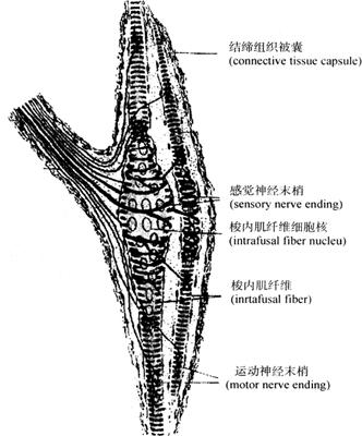 图2-55 表皮内游离神经末梢 (2)有被囊神经末梢(encapsulated nerve ending):外包裹有结缔组织被囊,常见的有如下几种:①触觉小体(tactile corpuscle):分布在皮肤真皮乳头内,多呈卵圆形,小体内有横列的扁平细胞,外包有结缔组织囊,有髓神经纤维进入小体时失去髓鞘,其分支盘绕在扁平细胞间,可感受触觉(图2-56)。②环层小体(paciniancorpuscle):分布于皮肤的皮下组织、肠系膜等处,呈圆形或卵圆形,体积较大,被囊是由数十层呈同心圆排列的扁平细胞组成,中央有一均质状圆柱体,有髓神经纤维失去髓鞘后穿入其中,可感受压觉和振动觉(图2-57)。③肌梭(muscle spindle):分布于骨骼肌内的梭形小体,外有结缔组织被囊,内含若干条细小骨骼肌纤维,称梭内肌纤维。感觉神经纤维的末端,进入结缔组织被囊后失去髓鞘缠绕在每条梭内肌上,主要感受肌纤维的伸缩变化(图2-58)。