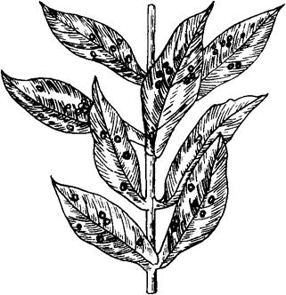 【症状】 病菌侵染后,植株下部叶片发生圆形病斑。初为红色的水渍点状,逐渐发展成为多角形的、褐色病斑。后期病斑中心变为白色,着生不明显的许多小黑点(图7-12)。