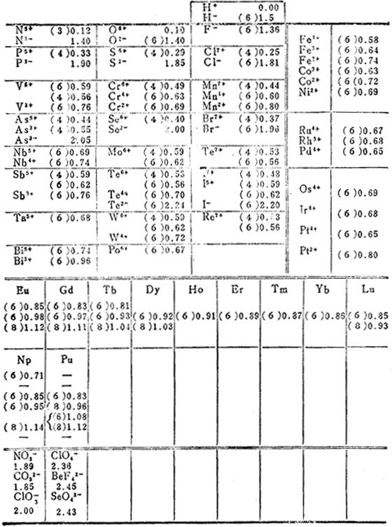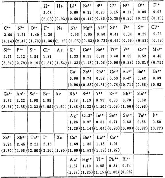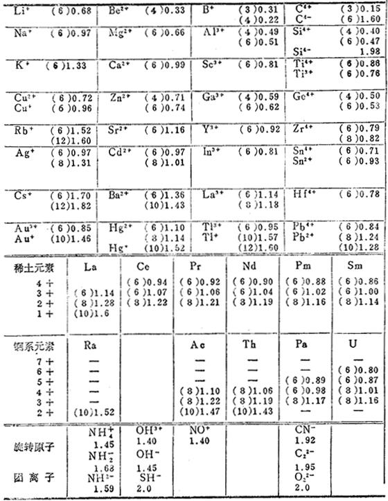 离子的晶体半径和单价晶体半径(括号内的数字)。