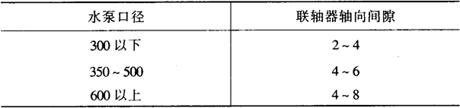 图8-59 水泵找正方法 1.纵中心线 2.横中心线 3.垂线 (2)找水平:找水平的目的是使水泵轴要呈水平状态,水泵的进、出口法兰盘面呈垂直状态,保证与进、出水管的连接正确。水泵找平常用以下几种方法: ①小型离心泵找平时,将水平尺靠在水泵进、出口的法兰盘面上和轴端靠背轮的端面上,用楔形铁块调整水泵的高低,使水平尺的气泡居中。 ②大中型Sh型水泵,可揭开泵盖,在泵座与泵盖接合面上选4个“+”字形的点,立水准尺,用水准仪观测四点水准尺的读数。如4个点水准尺读数相等,表明水泵呈水平。如有误差且4个方向误差值超过0.3~0.5mm/m,表明水平超过规定值,应用楔形铁块调整直到达到要求为止。 (3)测标高:水泵标高是指水泵轴中心线的高程。测标高的目的是检验水泵实际安装高度和设计安装高程是否符合,以保证水泵在允许的吸水高度内工作。测标高的方法是,利用两个标杆,一个放在预定的基面上,另一个放在泵轴中心线的基面上,用水准仪标定,经计算后找出实际安装高程。 3.动力机的安装 安装动力机时因传动方式不同,对安装的要求也不一样。 直接传动多用于电动机。安装电动机时要求电动机轴与水泵轴在一条直线上,即有同心度要求。电动机安装的关键在于对准已安装好的水泵轴中心线,也就是把水泵和电动机的两个联轴器调整到平行、对中,间距适宜。 水泵和电动机的联轴器之间留有一定的间隙,称为轴向间隙,是用来防止水泵轴或电机轴有轴向窜动时,两联轴器可能发生的碰撞现象。按规定要求可参考表8-59调整。 表8-59 联轴器轴向间隙要求(单位:mm)
