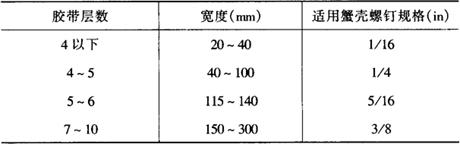 胶带螺钉连接是把平型带两头搭在一起,用专用蟹壳螺钉紧固,一般只用4只,蟹壳螺钉的选用可参考表8-61。安装时要注意螺钉不要露出太长;胶带搭接应顺着胶带轮的转动方向,以免接口直接撞击胶带轮,发生危险。 表8-61 蟹壳螺钉的选择